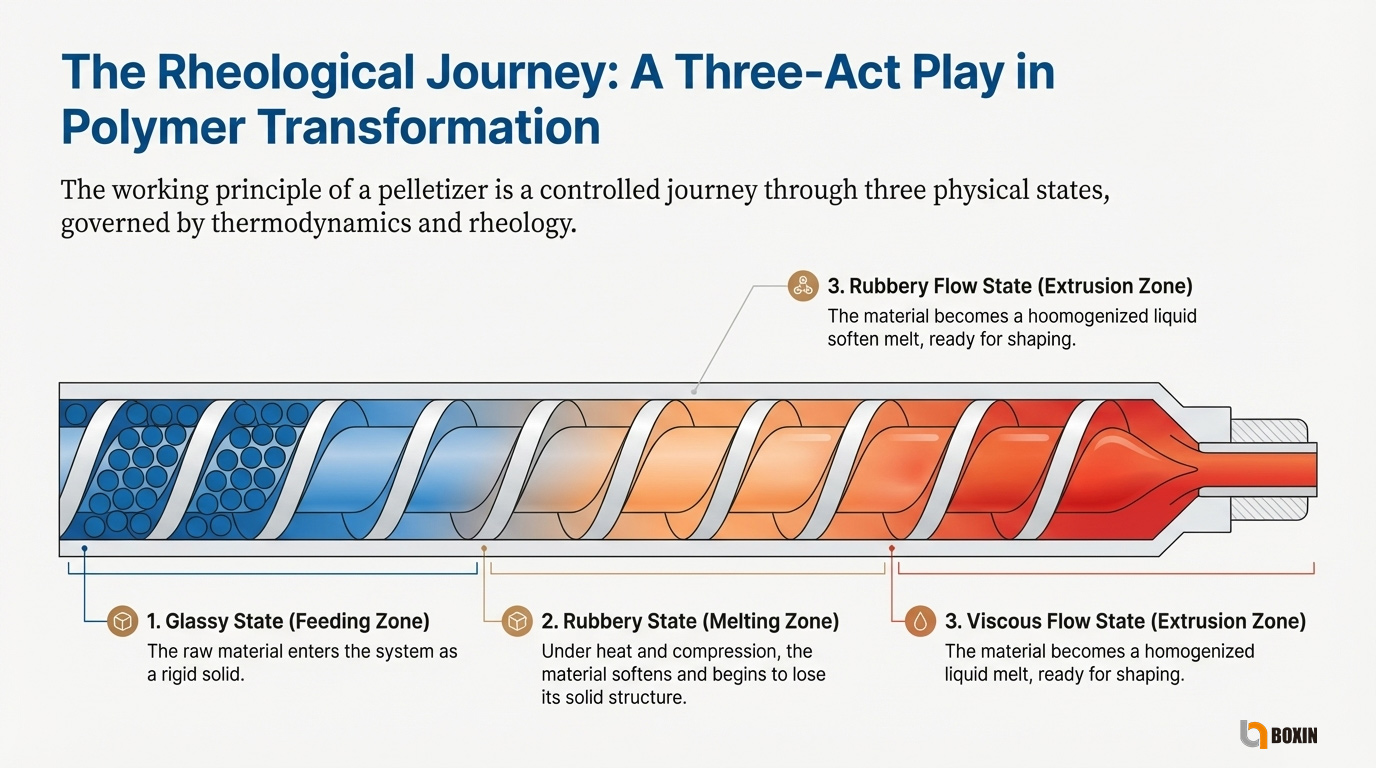 The working principle is based on polymer extrusion theory. While external heating provides the initial energy, core energy during stable production stems from the conversion of mechanical energy into thermal energy. The process involves three physical state transitions: Glassy State, Rubbery State, and Viscous Flow State.