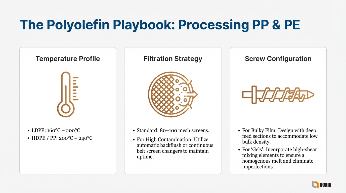 Screw Strategy: Deep feed sections for bulky film; high shear for "gels."