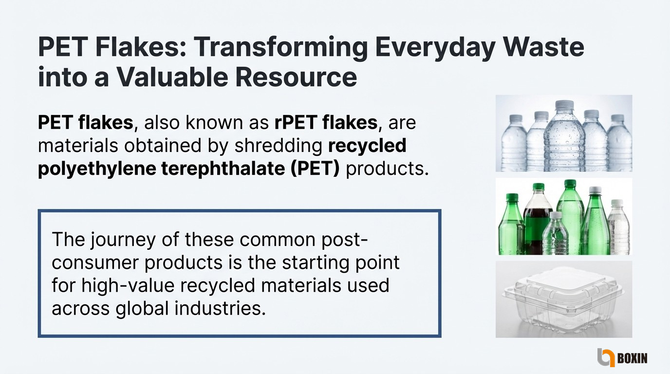 PET flakes, also known as rPET flakes, are materials obtained by shredding recycled polyethylene terephthalate (PET) products. They are commonly sourced from water bottles, carbonated drink containers, and various types of food packaging.